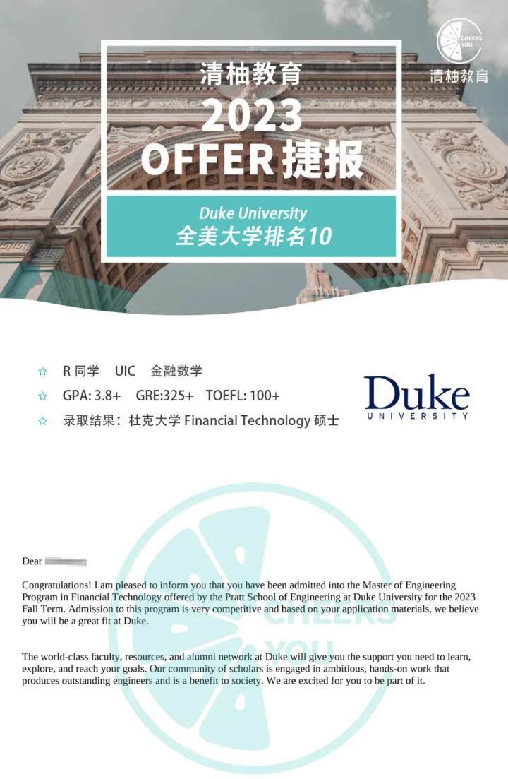 杜克大学的FinTech是20年新开设的,是首批以工程学院为基地的项目之一,因此项目不是十分出名,申请人数也不多,所以双非院校的学生也有机会申请到。