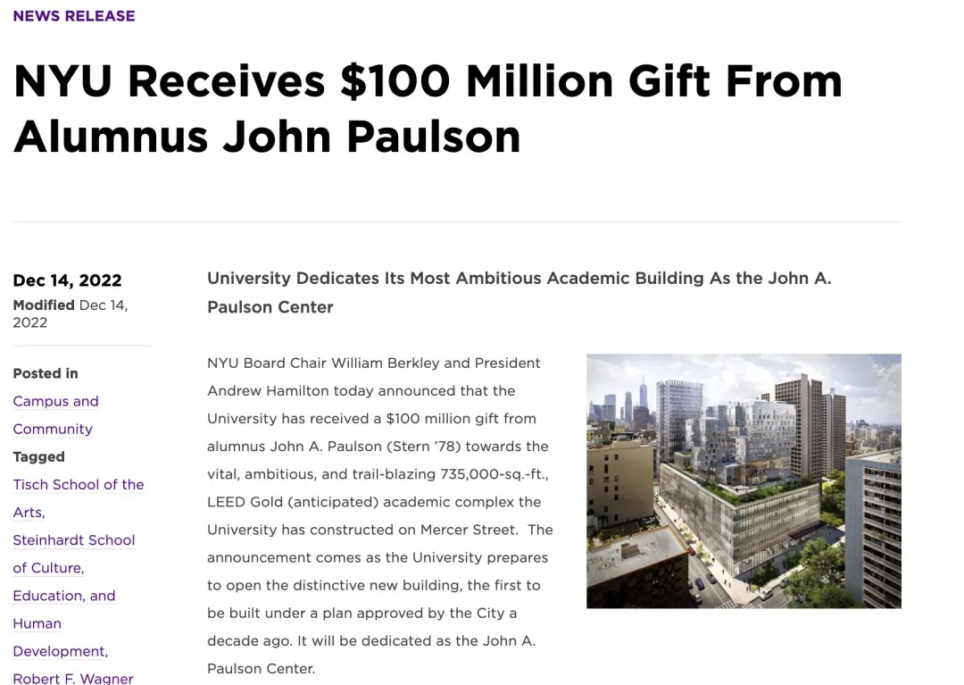纽大去年获赠Stern商学院校友John Paulson一亿美元捐款,用于建设以他名字命名,占地735,000平方米的约翰·A·保尔森中心。