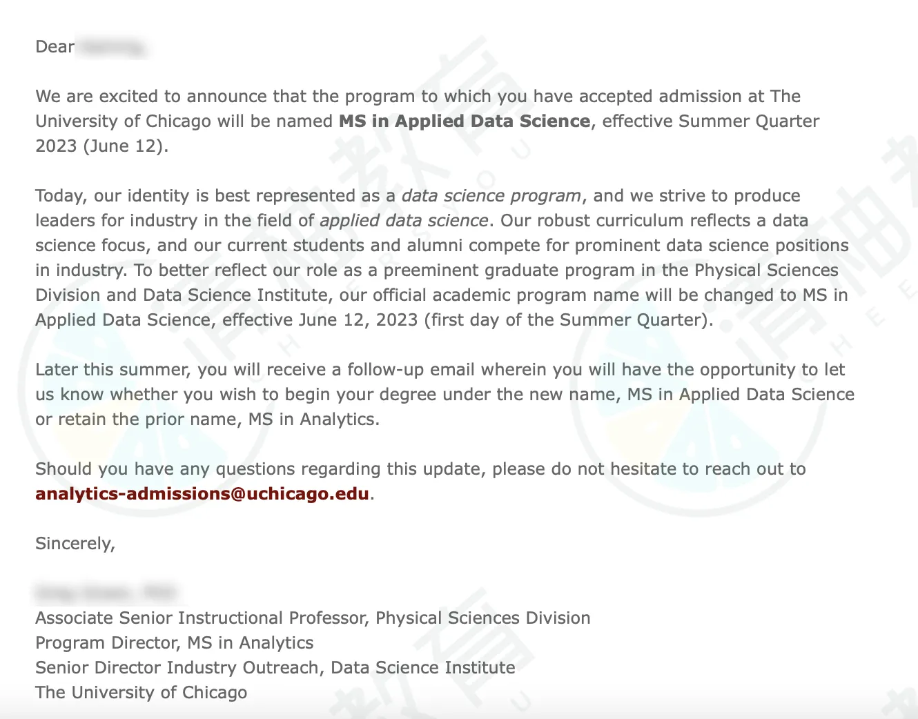 芝加哥大学近日邮件通知已录取MS in Analytics的各位学生,该项目6月12日就要改名了,正式变为Applied Data Science!