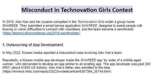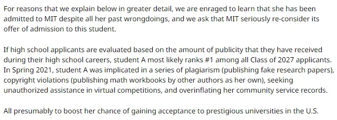 愤怒的家长们指控MIT 2027届录取新生、韩国法务部长之女Alex Han涉嫌各种学术舞弊行为,包括大量剽窃研究论文、侵犯版权、请人代笔、在竞赛中找外援,以及夸大社区服务。