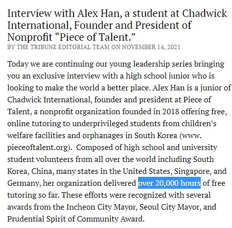Alex Han声称自己曾组织全世界100多名学生,为弱势群体学生提供超过2万小时的免费线上教育。该事迹不仅被洛杉矶媒体报道,还让她获得了首尔市长奖等多份荣誉。