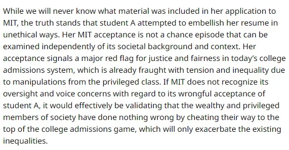 “虽然我们永远不会知道Alex Han的MIT申请中包含了哪些材料,但事实是她曾试图以不道德的方式美化简历。”