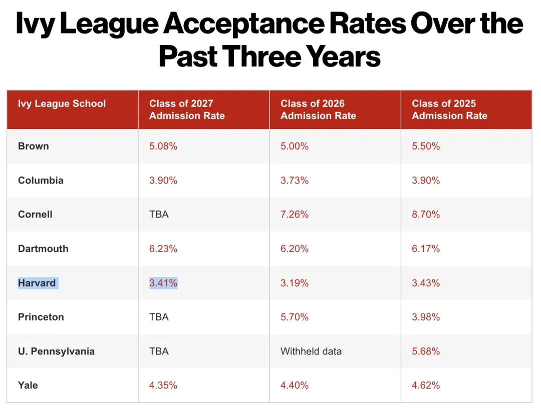 今年的藤校录取率创下新低,哈佛的录取率仅为3.41%,其他几所藤校的录取率也低至4%-6%。