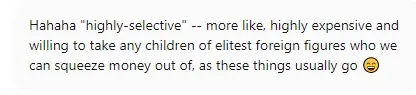 “名校的高选拔性就是个笑话,无非就看那些有钱有势的精英家长愿意出多少钱罢了。”