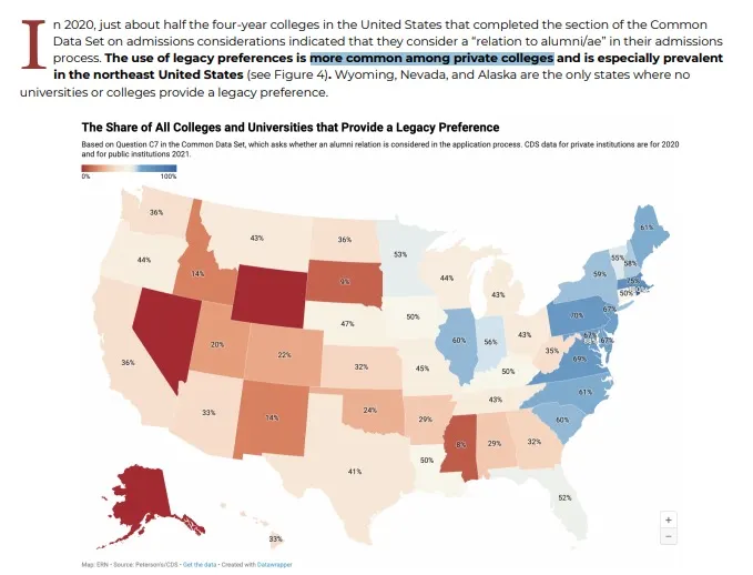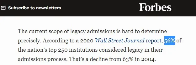 尽管如今在多方压力之下,美国高校尝试转型,Legacy录取在Top250美本中的占比从64%减少为56%: