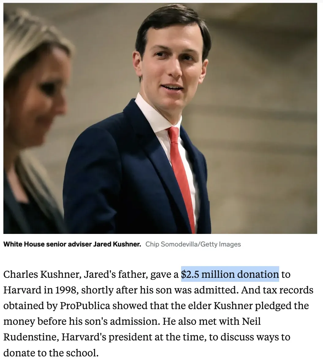 比如美国前总统川普的女婿Jared Kushner,正是凭借父亲向哈佛捐赠的250万美元,于次年顺利进入哈佛就读。