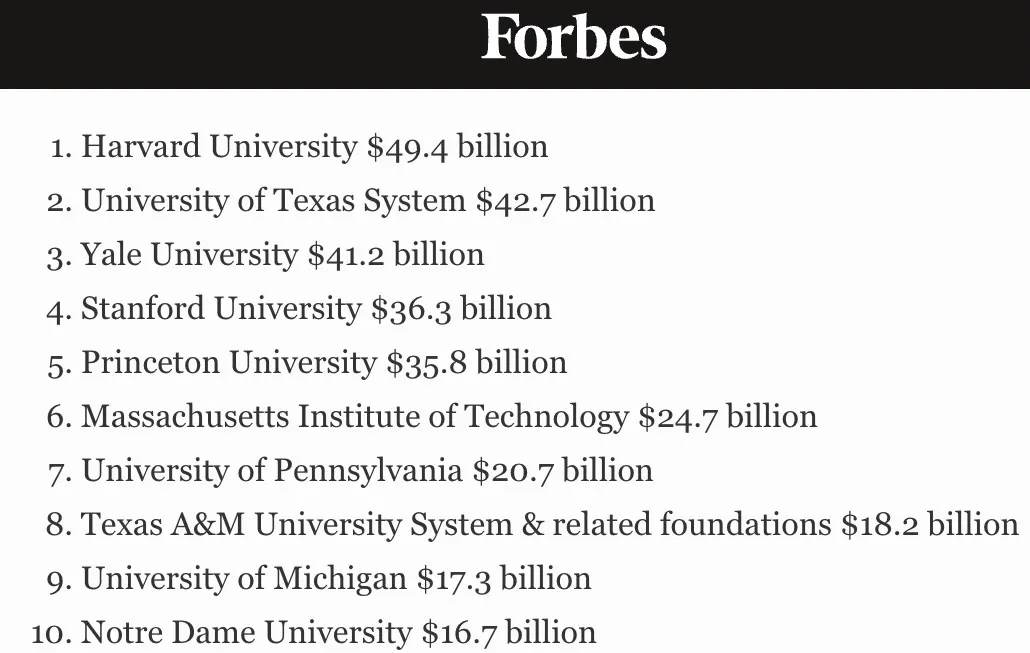 凭借着各种校友和社会捐款,一些学校富可敌国。2022年,哈佛捐款总额高达494亿美元。