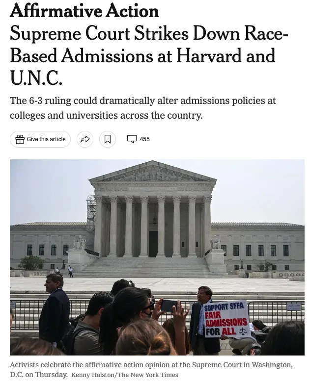 美国最高法院历史性裁决:禁止美国大学招生录取考虑种族因素!