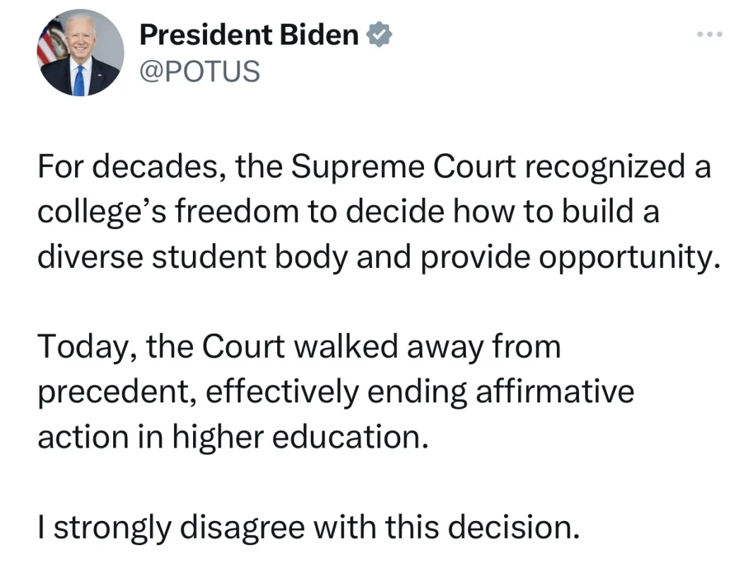 美国总统拜登表示反对“强烈反对最高法院的裁决”,并称“美国大学和整个国家在拥有更大的种族多样性时,才会变得更加强大。”