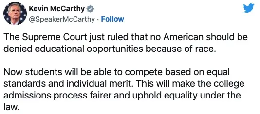 众议院议长对最高法院的最新决定表示认可,称“现在学生将能够基于平等的标准和个人优势进行竞争。”