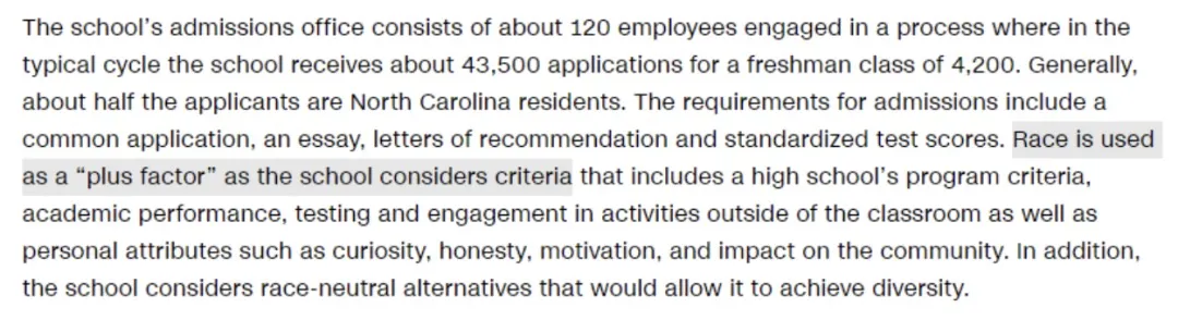 哈佛和北卡罗来纳大学在内的多所高校表示,将“种族”纳入对申请人进行整体评估的因素之一,是推进学校多元化的必要手段。UNC甚至将“种族”作为招生中的申请加分项: