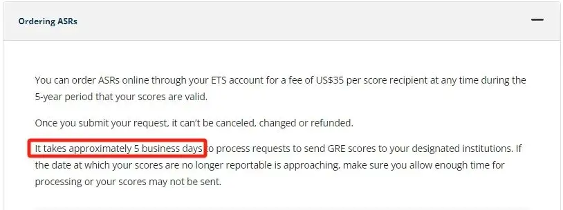 发送GRE成绩的请求大约需要5个工作日来处理。寄出又需要时间,线上成绩的递送将在接到考生需求后的3至5个工作日寄出成绩,建议同学们至少在网申结束前半个月完成分数的递送!