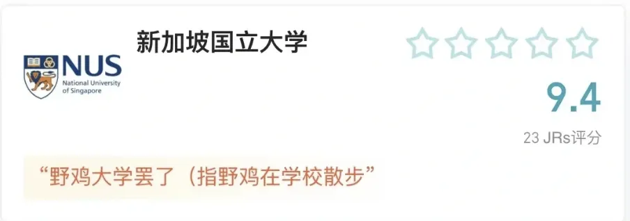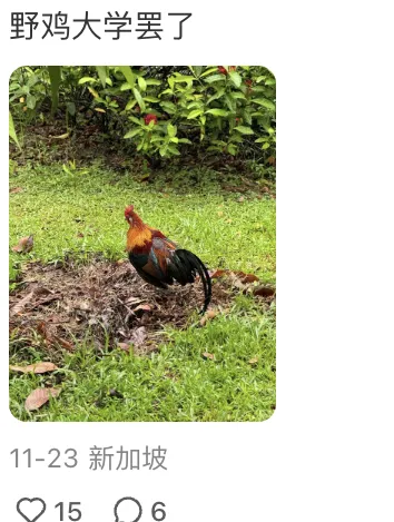 新加坡国立大学:野鸡大学(指野鸡在学校散步)。