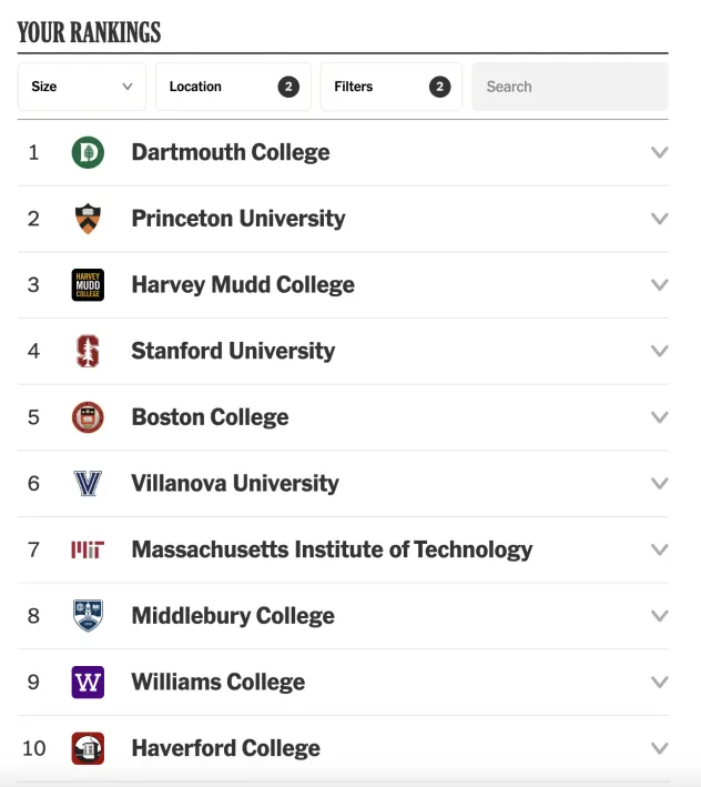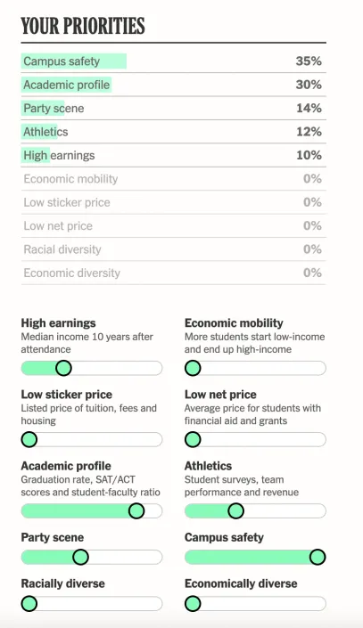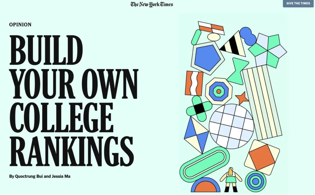 《纽约时报》最近推出了一个DIY大学排名工具,可以根据个人需求生成定制化的榜单。