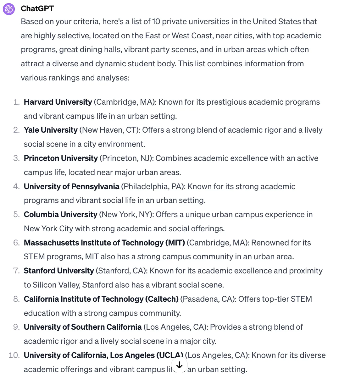 不过其实也可以去问ChatGPT,自定义化程度更高。比如择校目标为:位于东西海岸、学术强、高选拔度的私立学校,且食堂好吃、靠近城市、学校里帅哥美女多、有Party社交活动,GPT4会给到如下list: