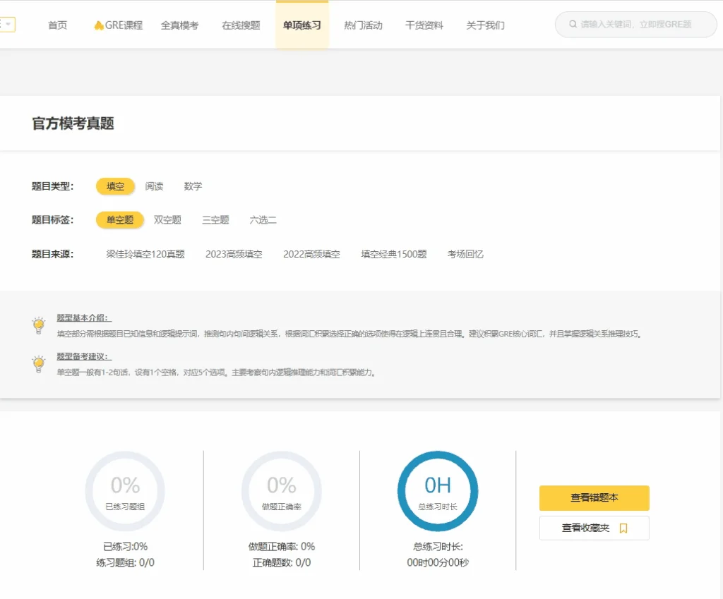 【单项练习】这个板块特别适合同学们做限时训练,20道题一组。同学们可以自行选择科目和文章题型,非常灵活。还有错题本可以帮大家自动收集错题。这边的题库也会持续更新哦~