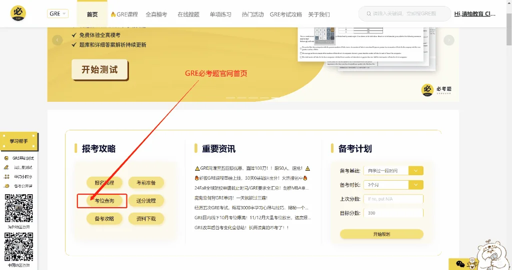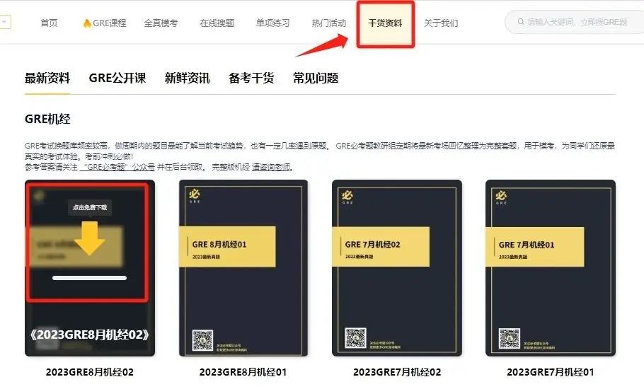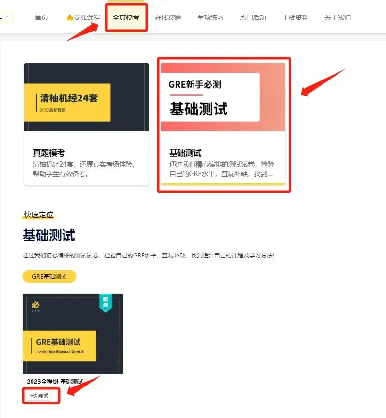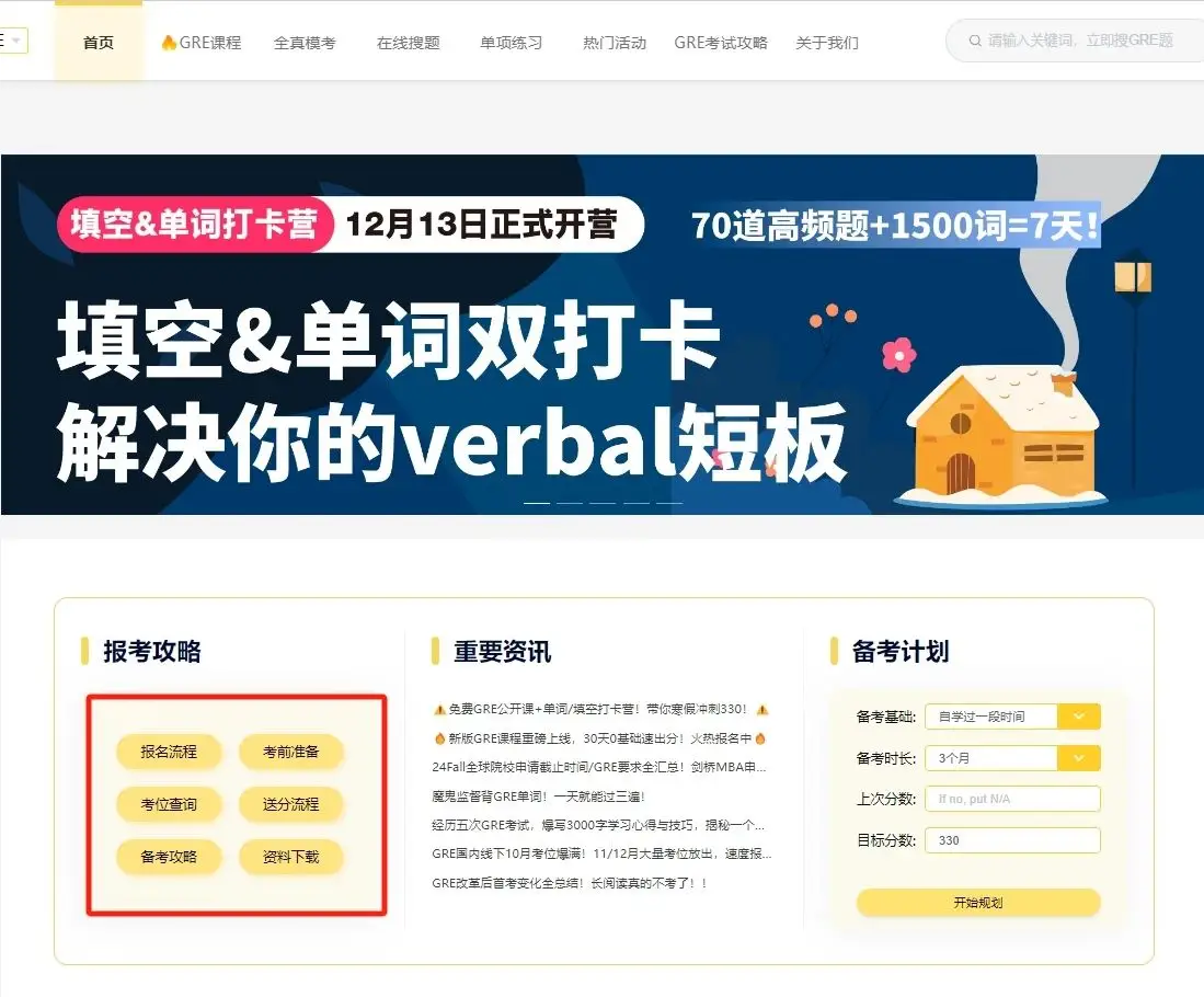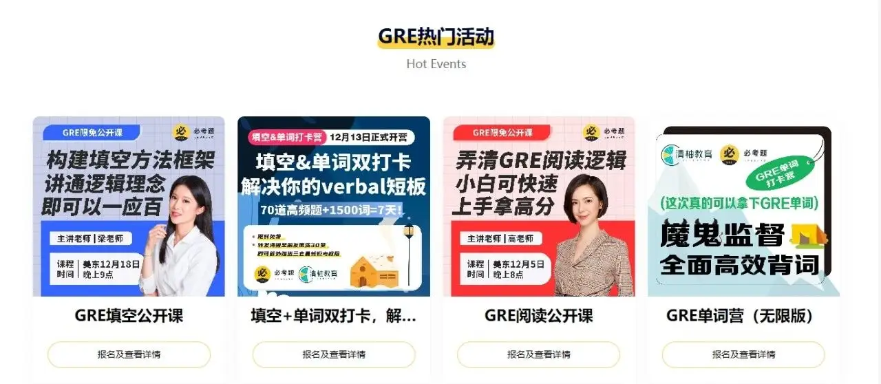 关于GRE备考的基础干货攻略都给大家整理好啦!同学们可以在必考题官网首页随时查看,包括GRE报名流程、考前准备、送分流程等。