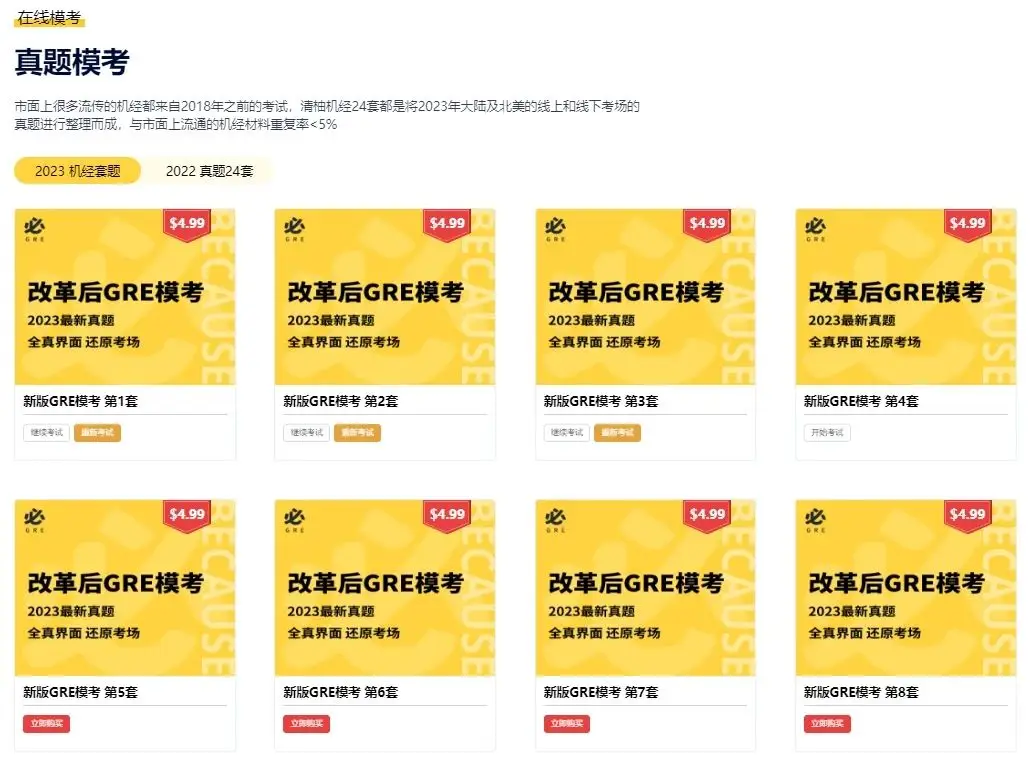 必考题模考目前一共更新了32套,2022机经24套,2023机经套题8套,全面适配改革后GRE