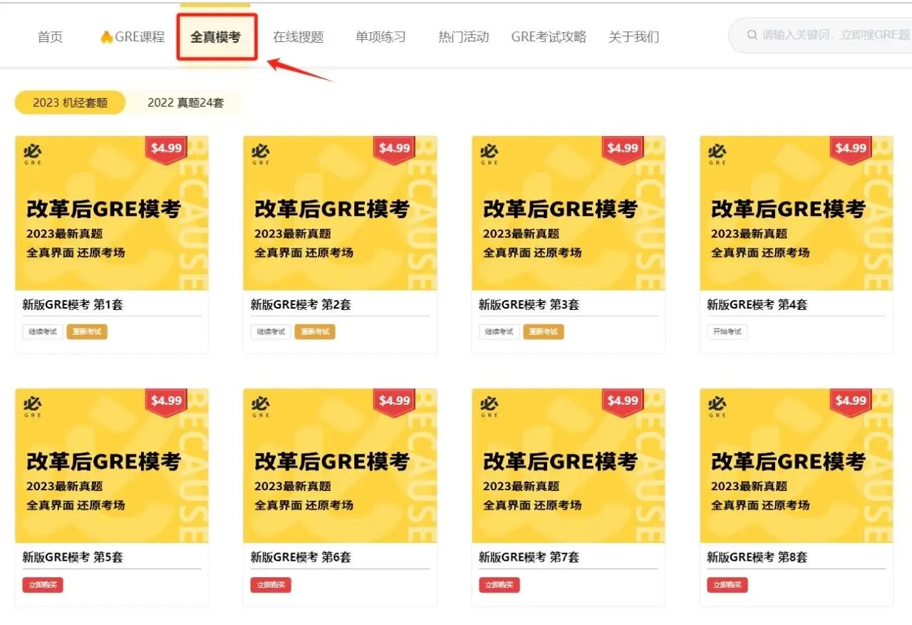 登录必考题官网(bikaoci.com)点击【全真模考】,下拉到【2023机经套题】界面,点击【新版GRE模考】就可以开始模考啦~