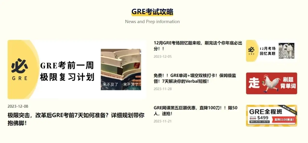 【首页】继续往下拉,可以看到一些最新的GRE考试攻略,了解关于GRE备考的最新信息。比如GRE改革最新信息、GRE考试报名折扣优惠、最新GRE学习资料,以及更多隐藏tips等你来发现~