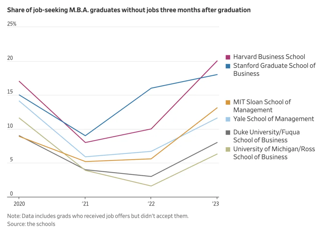 根据WSJ报道,哈佛、斯坦福、MIT等顶尖商学院的MBA毕业生待业比例达到新高。