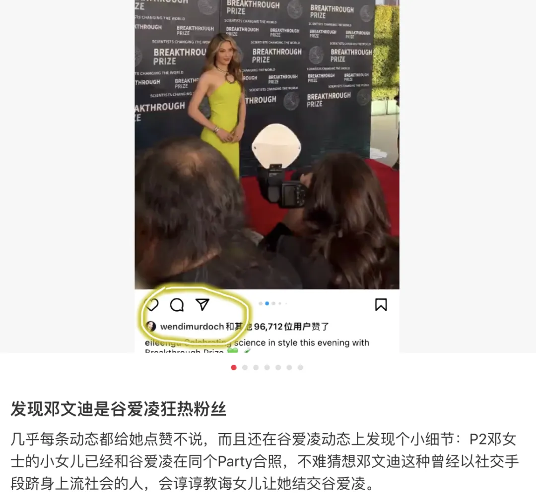 有趣的是,邓文迪似乎还是谷爱玲铁粉,日常INS点赞,小女儿也和谷爱玲多次Party合影。