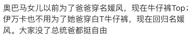 网友调侃:奥巴马的女儿为了老爸走名媛风,伊万卡为了川普走亲民风,现在大家都做回了自己😅