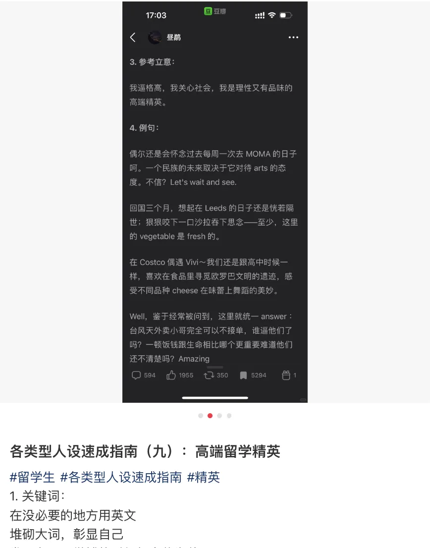 小红书上一搜就能看到各种“留学人设指南”,让你迅速掌握各种咯噔文学,郭敬明看了也汗流浃背: