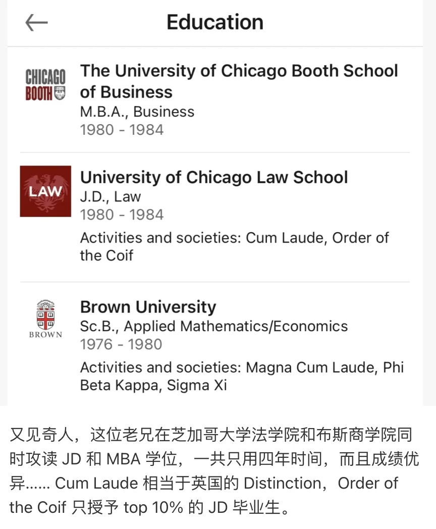 四年拿到芝大的JD/MBA双学位,且是Top10%的Order of the Coif。而且本科布朗,大概率出身不错。