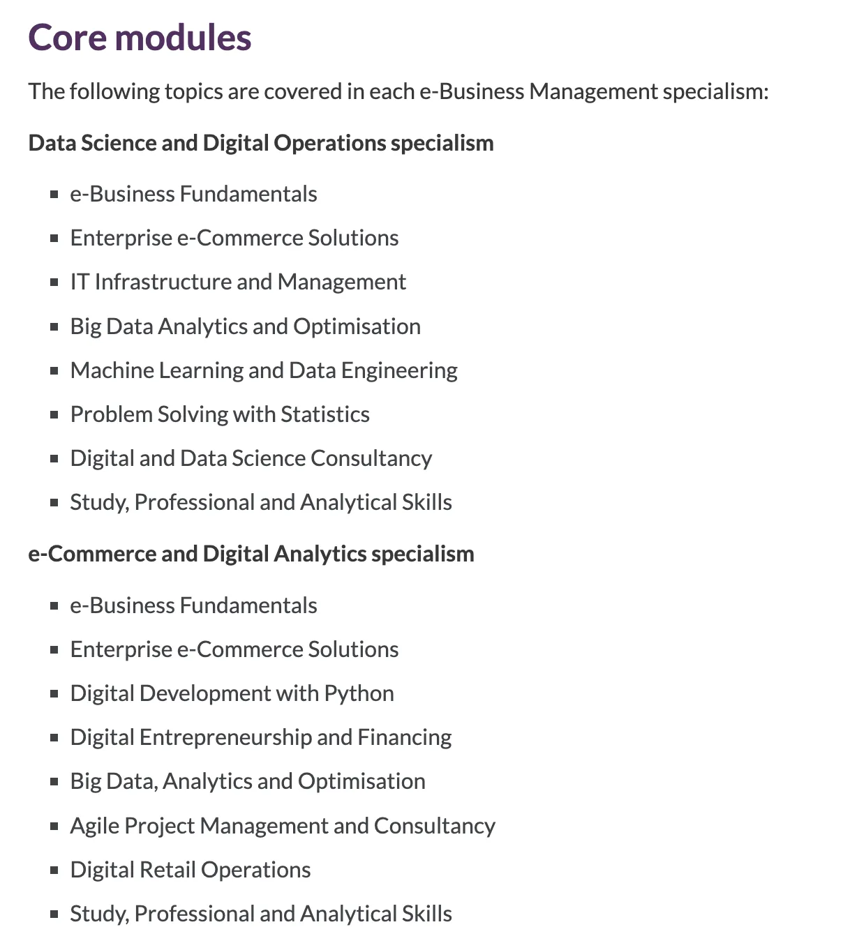 华威大学的电子商务管理专业课程设置丰富,主要分为了数据科学和数字运营、电子商务和数字分析、数字营销以及数字技术管理四个模块。在授课的重点当中也囊括了从数据科学专业技术到营销管理等多个层面,包括但不限于以下几个方向: