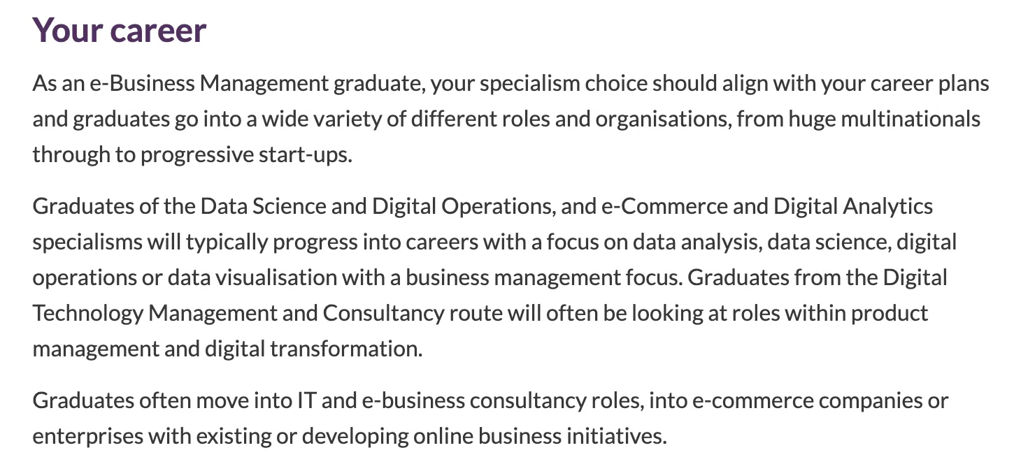 华威大学的电子商务管理专业毕业生可以在信息技术和软件相关的公司工作,特别是工程或制造业的电子商务咨询公司等。近些年的毕业生有去HP、KPMG、PWC、三星的,无论是做技术或是咨询都是不错的选择。