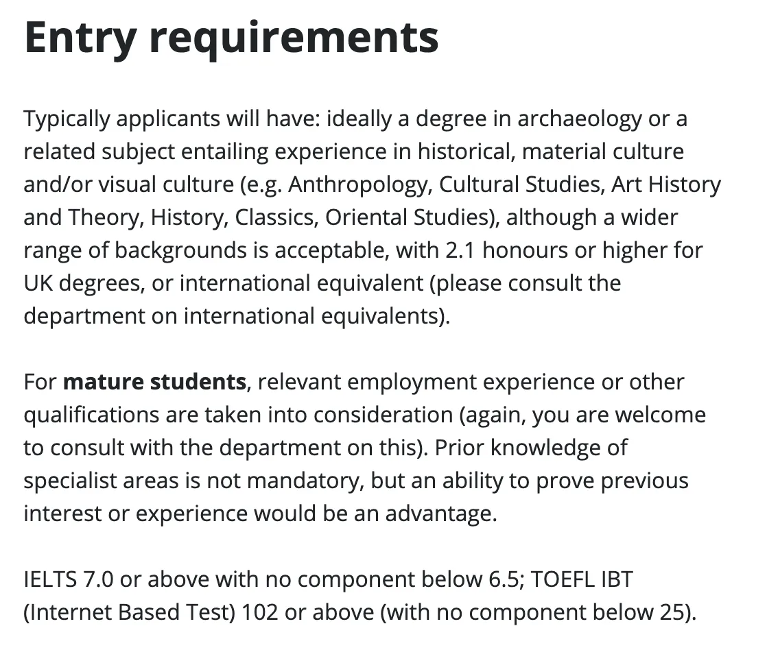 1. 学术背景:通常要求申请者拥有与考古学相关的学士学位,例如历史、人类学、古典学等。如果你的本科专业不是直接相关,但你有相关的课程背景或者研究经验,也可以申请。