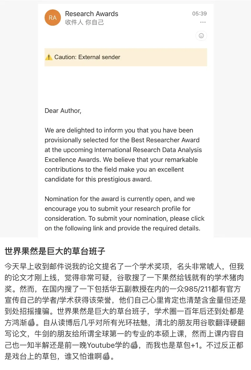 最近有同学发现,自己的论文才刚发表,第二天就收到邮件被提名了某学术奖项,且名头非常唬人。