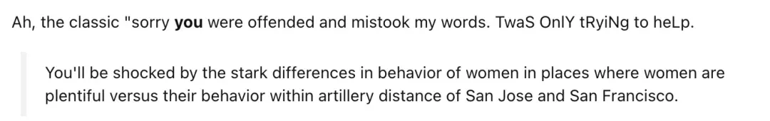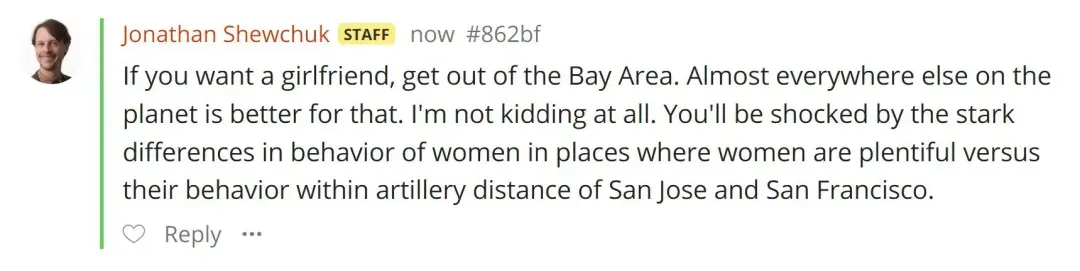 “如果你想找女朋友的话,远离湾区。地球上任何一个地方都比这里好。你会发现女生多的地方和湾区的女生,有天壤之别。”