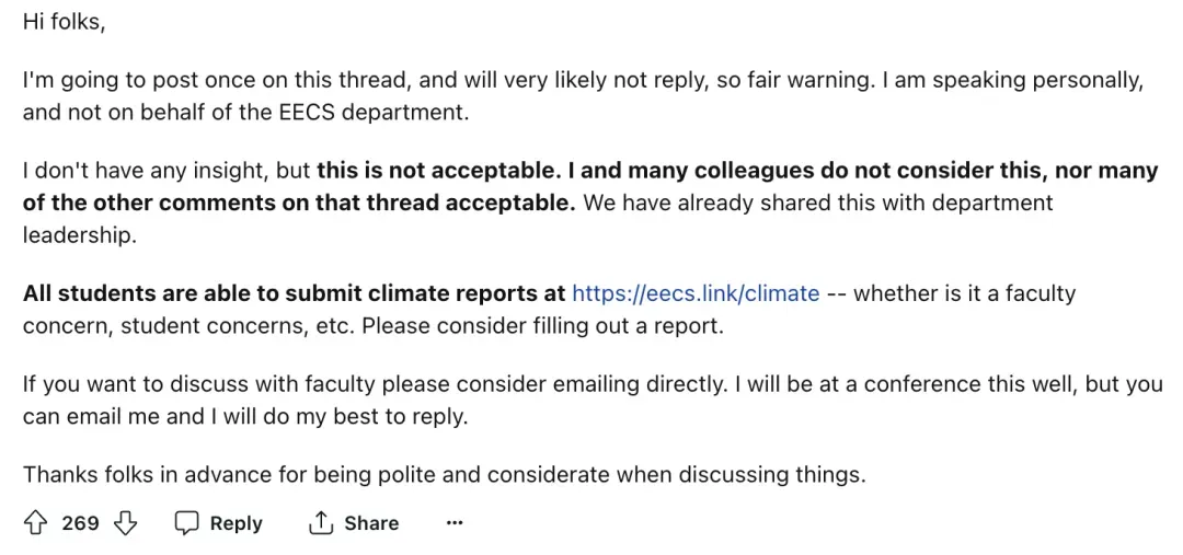 这位教授的同事也看不下去了,告诉大家可以去EECS学院官网举报👇