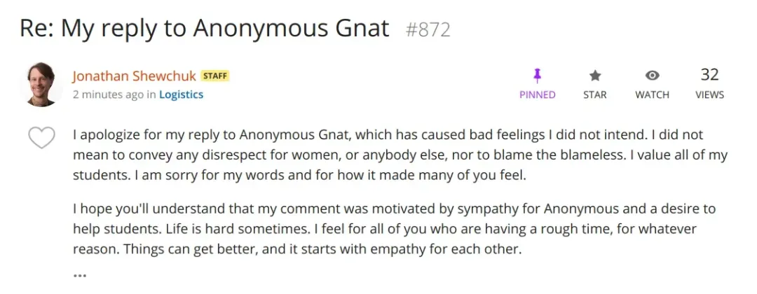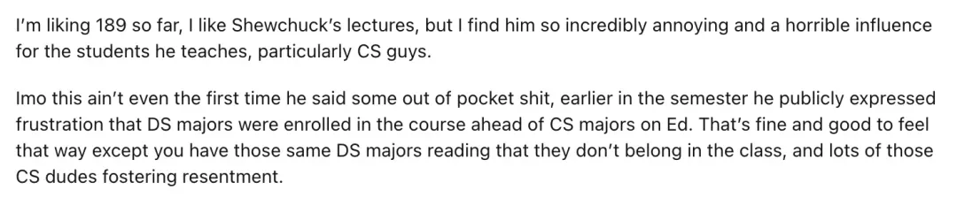 Shewchuck不仅厌女,甚至排外。据同学爆料,这位教授不止一次表达过,不希望Data Science的同学选这门课,因为这是给CS学生开设的。