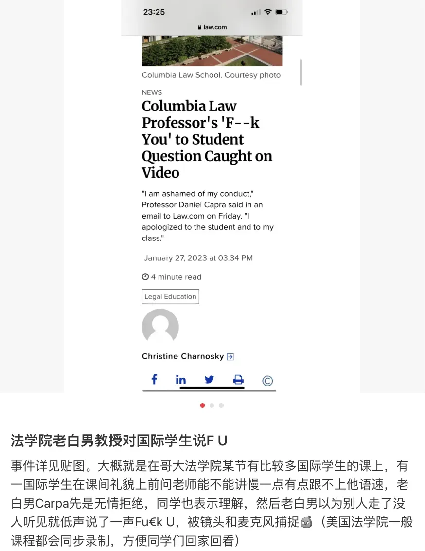 Daniel Capra是哥大法学院的教授,课上有一名国际学生希望他能放慢语速讲课。他先是傲慢拒绝,等学生走掉之后甚至还说了F word❓