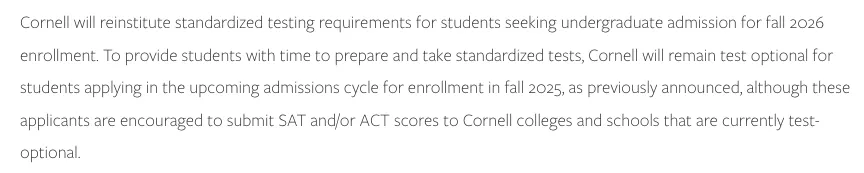 本周,康奈尔大学官宣全面恢复标化考试要求,26Fall本科申请者必须提交SAT/ACT成绩。