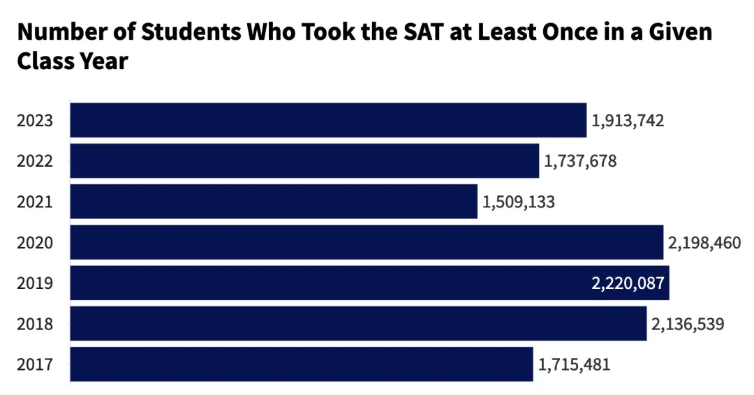 后疫情时代,每年参加SAT考试的申请者人数都在持续增加。就算没有硬性要求,今年仍有超过42万的申请者提交了标化成绩。