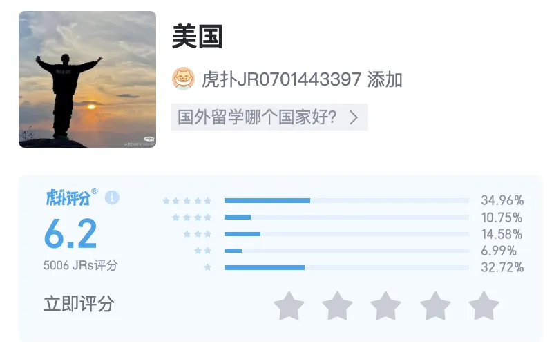 作为大热的留学目的地,美国的评分竟然只有6.2分,嗯~怎么不算真实呢~