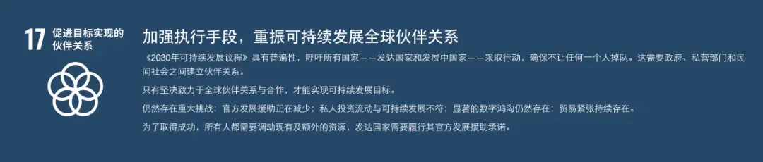 联合国官网对SDG17做出了详细解释,加强全球伙伴关系,通过财政、技术、能力建设等多方面的支持,促进可持续发展目标的实现。它强调团结合作、资源共享是推动其他可持续发展目标的关键推动力,最终实现可持续发展目标。