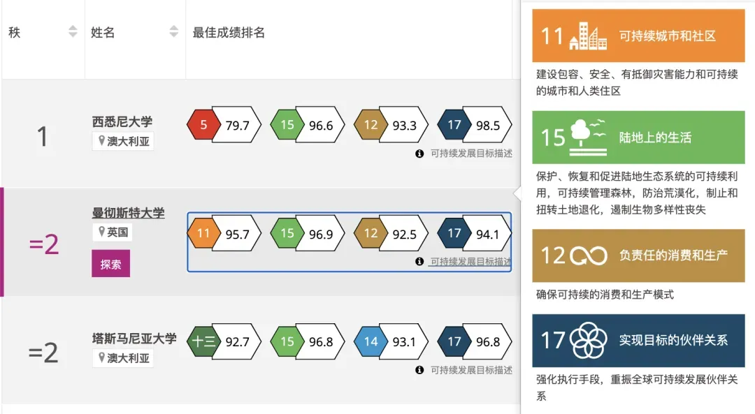 排名第二的曼切斯特大学也在SDG11可持续城市和社区、SDG12负责任消费和生产、SDG15陆地生物,和SDG17促进目标实现的伙伴关系四个领域得分名列前茅。