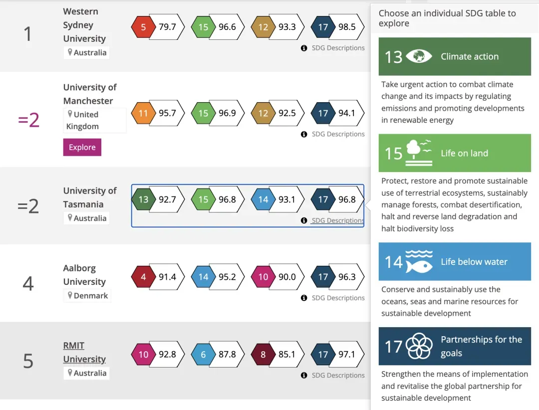 并列第二的塔斯马尼亚大学也在SDG13气候行动、SDG14水下生物、SDG15陆地生物,和SDG17促进目标实现的伙伴关系四个领域排名领先。