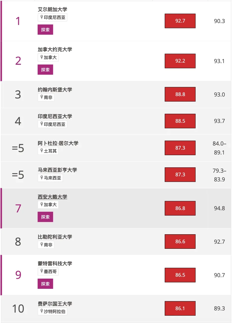 在排名中,印度尼西亚的埃尔朗家大学、加拿大的约克大学,和南非的约翰内斯堡大学位居前三。