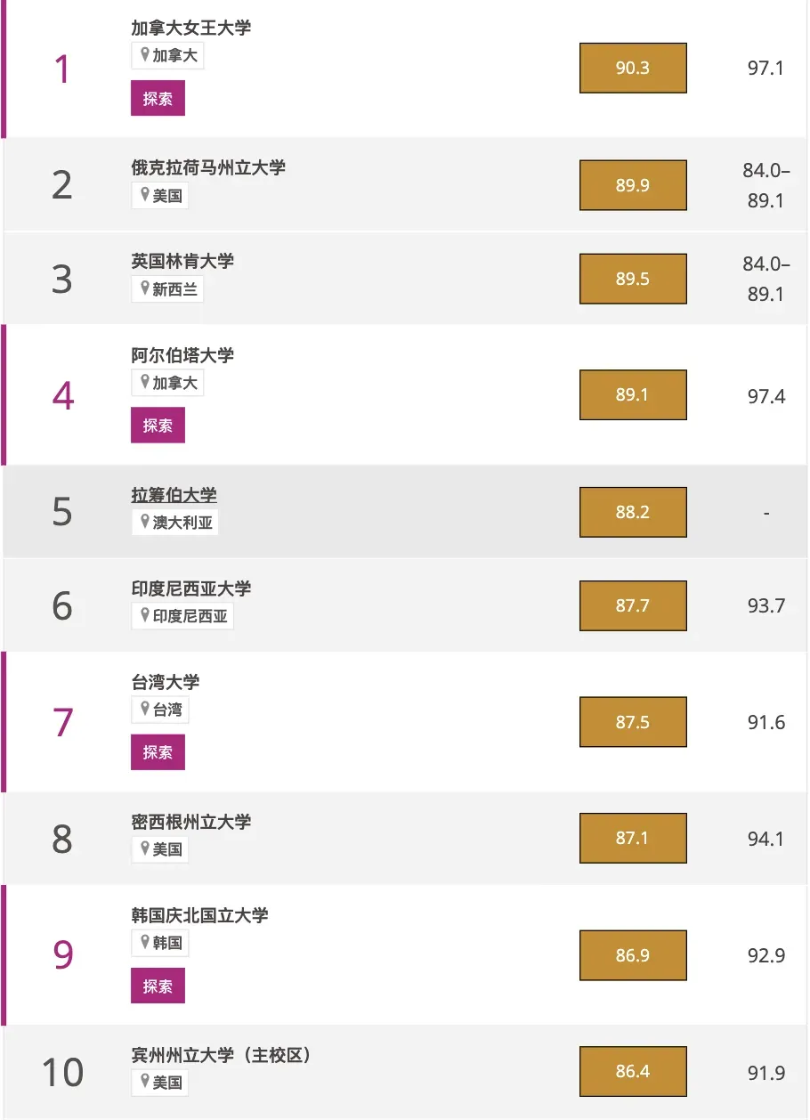 此项排名的前三所大学分别为:加拿大女王大学、美国的俄克拉荷马州立大学,和新西兰的英国林肯大学。加拿大女王大学也是榜上唯一一个此项得分超过90分的高校。