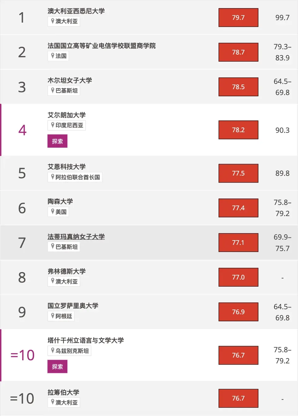 该排名的前三位大学分别是澳大利亚的西悉尼大学、法国的矿业电信学院商学院,和巴基斯坦的木尔坦女子大学。