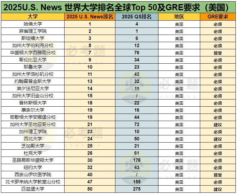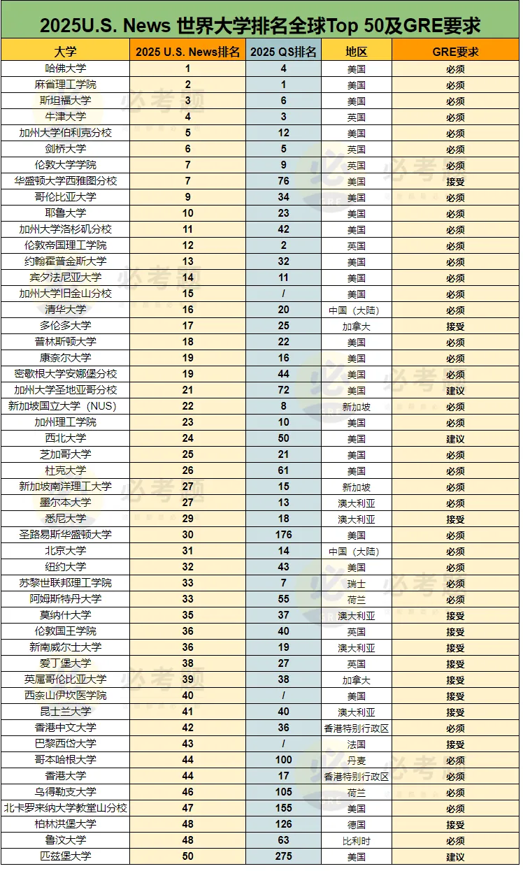 不论是U.S News还是QS排名,想申请榜单前Top50院校,一份优秀的GRE成绩都必不可少!