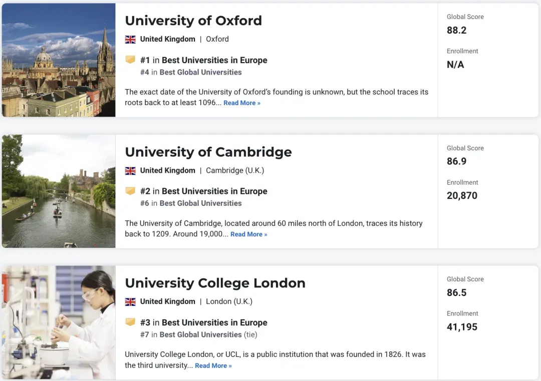 而在今年 QS 全球大学排名中位于第二的显眼包帝国理工学院,在 U.S. News 排在第 12 位。