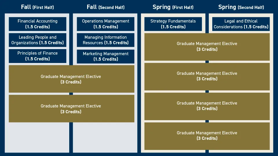 财务会计、运营管理、领导员工及组织、管理信息资源、金融学原理、营销管理、法律和道德考虑和战略基础