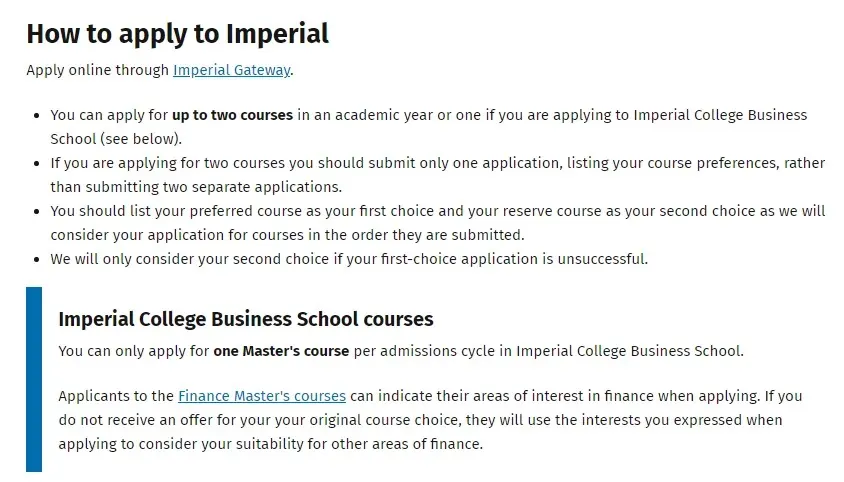 帝国理工学院规定每个申请季学生只能提交一次申请。对于商学院的申请,学生只能选择一个志愿,除非申请的是金融类专业,此时可以选择指定其他感兴趣的金融专业作为备选。